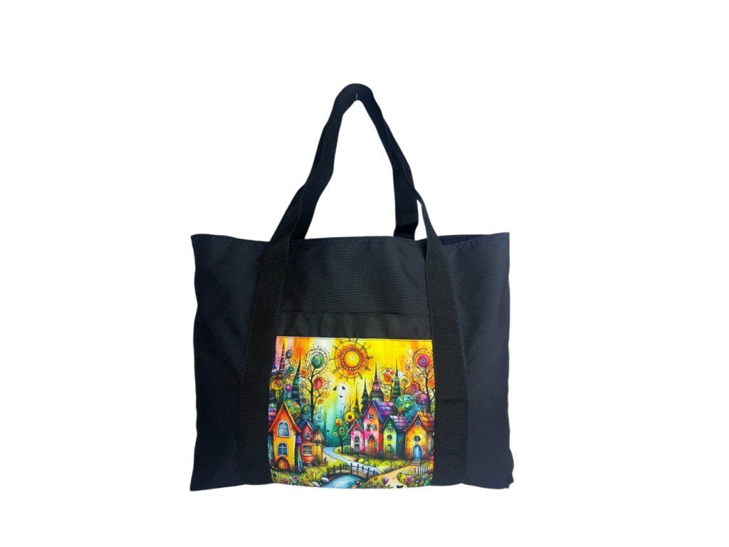 Taška má na přední straně praktickou kapsu s krásným motivem je zcela vypodšívkovaná kočárkovinou, která je opatřena kapsou ve stejné barvě tak, aby se taška dala nosit a použít oboustranně 😊