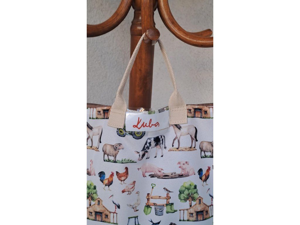 Taška je ušitá z pevné voděodolné kočárkoviny, která je snadno omyvatelná třeba jen otřením vlhkým hadrem nebo snadno pratelná při max 40 stupních bez aviváže , KTERÁ BY PORUŠILA NEPROMOKAVÝ ZÁTĚR.