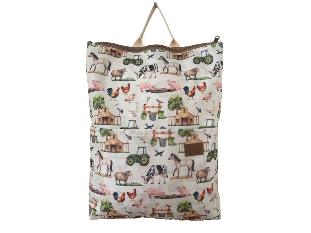 Taška má na přední straně 2 velké kapsy. Vhodné na nezbytné drobnosti např. spodní prádlo nebo malé poklady. Jedna hlavní kapsa je opatřena zipem, poutkem na zavěšení a snadné přenášení. Na zadní straně u našitého poutka je průhledné 7/3 cm okénko na jmenovku.